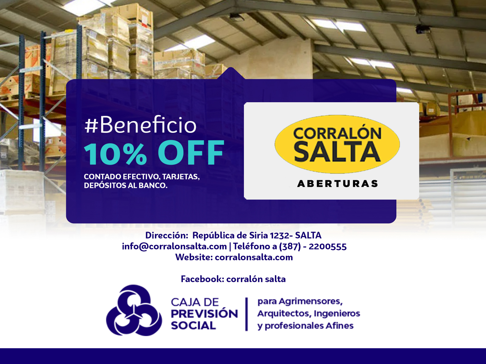 Corralón Salta Aberturas ofrece a nuestros afiliados un 10% de descuento sobre la tarifa de mostrador.